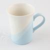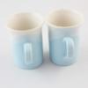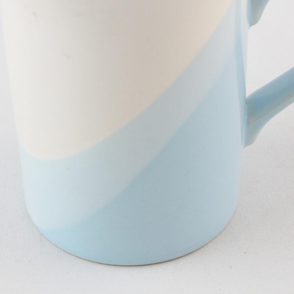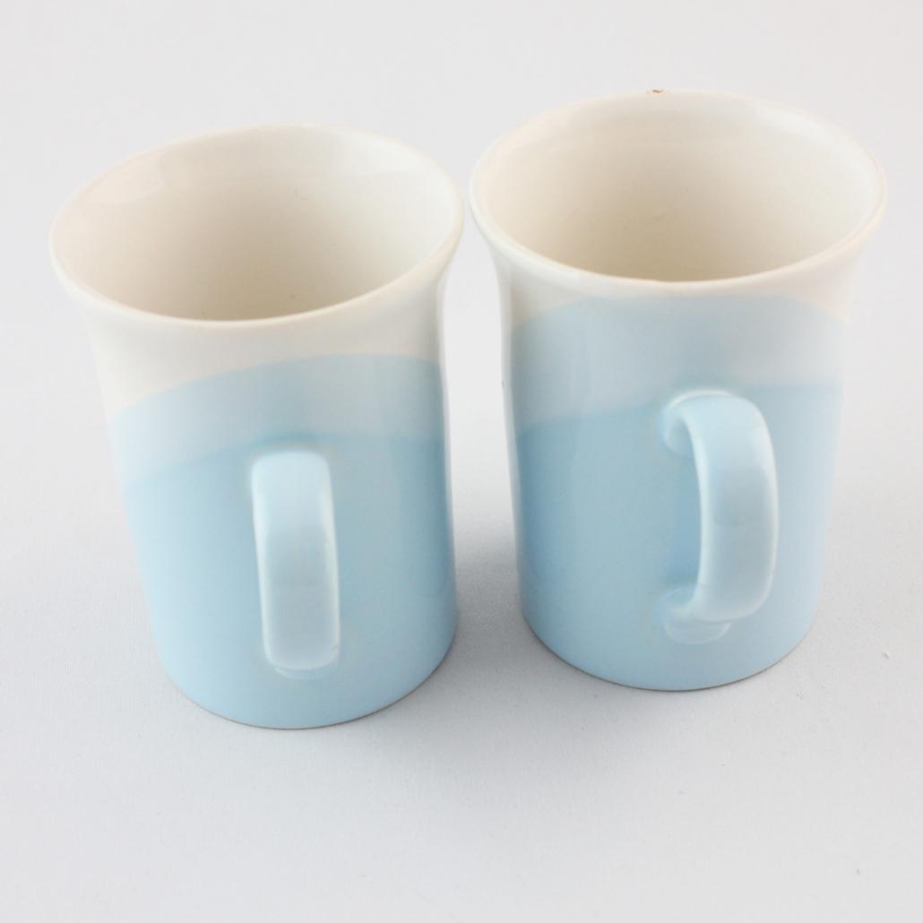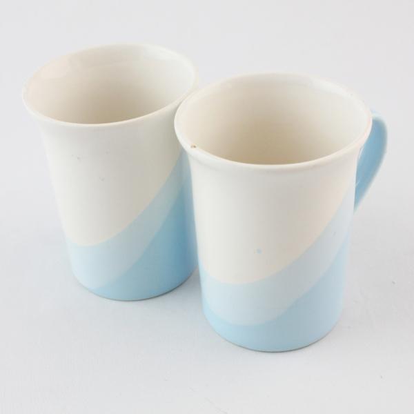 Twee mooie mokken met zachtblauwe strepen. Op één mok zit een klein chipje.